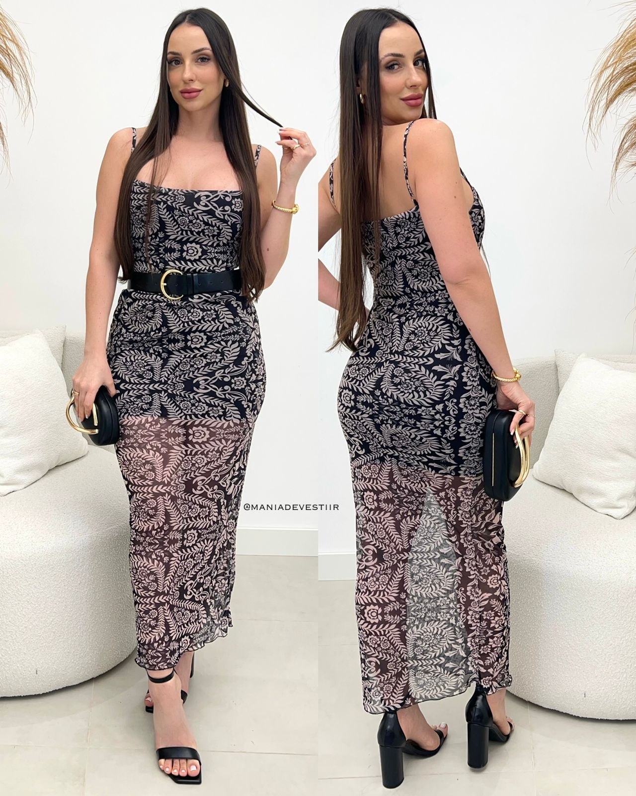 Medidas: busto 74 cm, cintura 72 cm, quadril 84 cm e comprimento 137 cm.